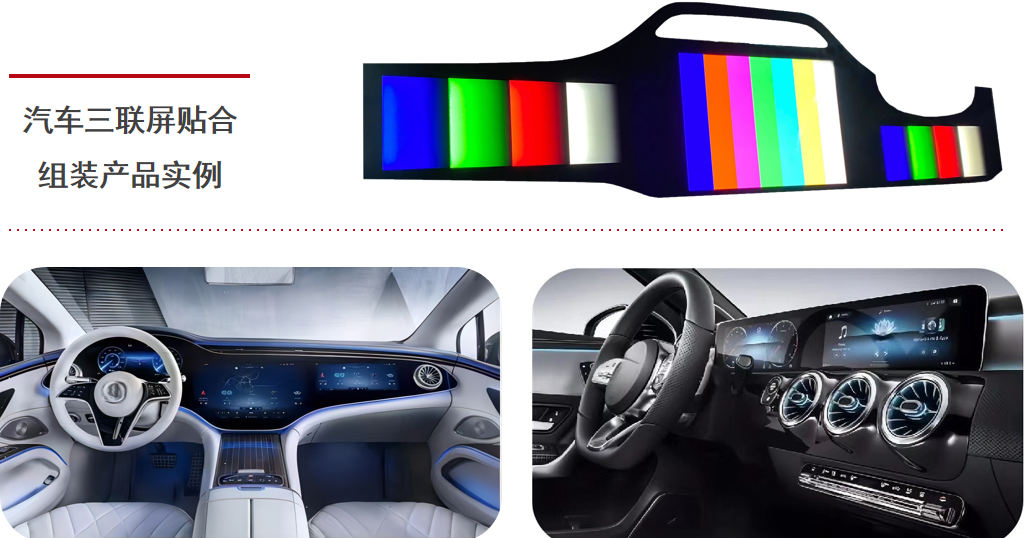 針對“三聯(lián)屏”的設(shè)計趨勢,中電科風(fēng)華推出了“三聯(lián)屏精密貼合組裝生產(chǎn)線”,在單個CG蓋板上,可以連續(xù)真空貼合三塊顯示模組。據(jù)中電科風(fēng)華營銷總經(jīng)理董哲介紹,借助三聯(lián)屏精密貼合組裝設(shè)備,目前“中控+主駕屏+副駕屏”最長可做到1.5米,最外層實現(xiàn)CG蓋板和OCA組裝貼合后,中間是顯示模組和三聯(lián)屏的貼合,最后實現(xiàn)背光、BLU組裝。目前,中電科風(fēng)華正在為眾多知名車企提供三聯(lián)屏顯示方案,其中藍思科技已經(jīng)在使用該公司“三聯(lián)屏精密貼合組裝”生產(chǎn)線。