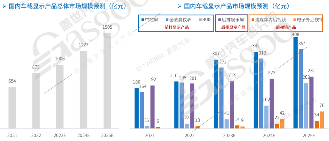 據(jù)蓋世汽車研究院統(tǒng)計,隨著車載顯示技術(shù)不斷迭代升級與滲透,預(yù)計到2025年國內(nèi)車載顯示市場將突破1505億元。其中中控屏、全液晶儀表、HUD 、后排娛樂屏、流媒體后視鏡、CMS的國內(nèi)市場將分別達到408、354、202、231、34、76億元。